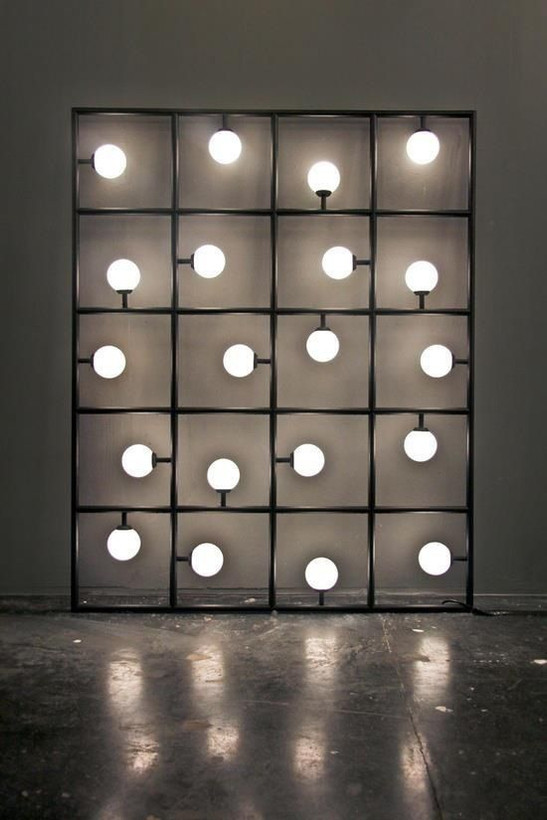 طراحی بر پایه یک شبکهبندی مستطیلی (Grid) از جنس فلز تیره (احتمالاً آهن با رنگ کورهای مات) بنا شده است. نظم موجود در خطوط عمودی و افقی، حس پایداری و آرامش بصری ایجاد میکند. این نوع طراحی به دلیل تکرار الگو، چشم را به دنبال خود میکشد و فضا را کشیدهتر نشان میدهدتضاد فرمی: استفاده از حبابهای کروی و نرم در میان کادرهای مربعی و سخت، یک تضاد بصری (Contrast) جذاب ایجاد کرده است